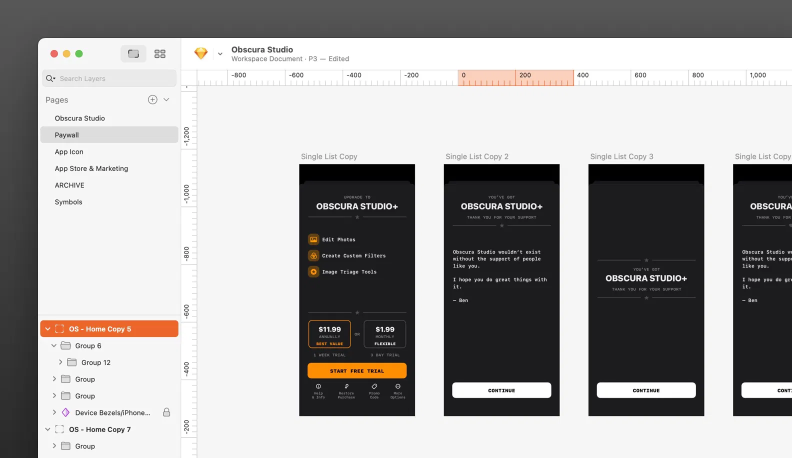 在不断更新的相机应用市场中,Obscura Studio需要频繁推出新功能。Ben提到,Sketch的非破坏性编辑与灵活的图层系统让他能够轻松回溯设计版本,在尝试新界面布局时保持良好的可控性。